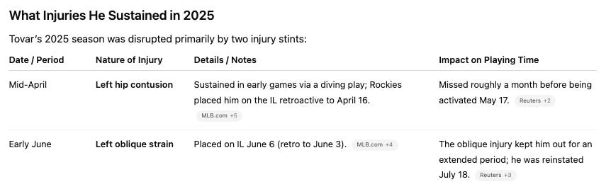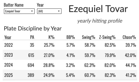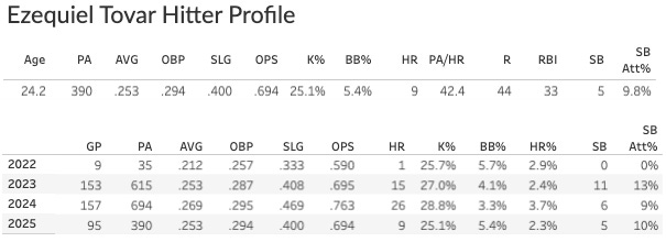 The team context is bad, and it holds the counting stats down (he scored just 83 runs in 695 PAs two years ago), but this guy will be in the lineup every single day while he’s healthy, slump or no slump. They have nobody else. Tovar is one of the faces of the franchise at this point. That’s pretty depressing for a guy with a career 82 wRC+, but that’s where we’re at.