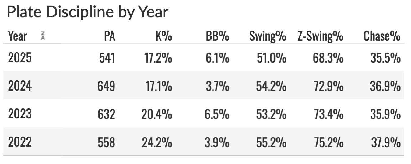He swung less in 2025, but it was mostly swinging less in the zone. The chase rate stayed about the same, he just took more strikes. But a lower swing rate does translate to more walks, and that worked for him.