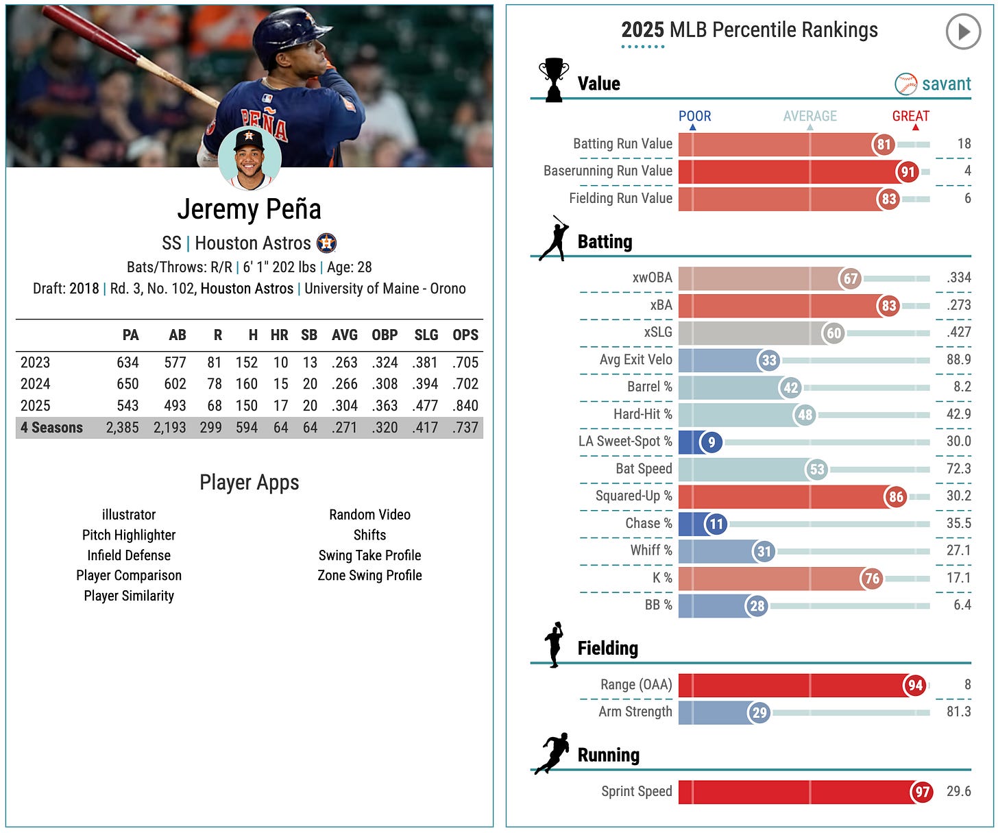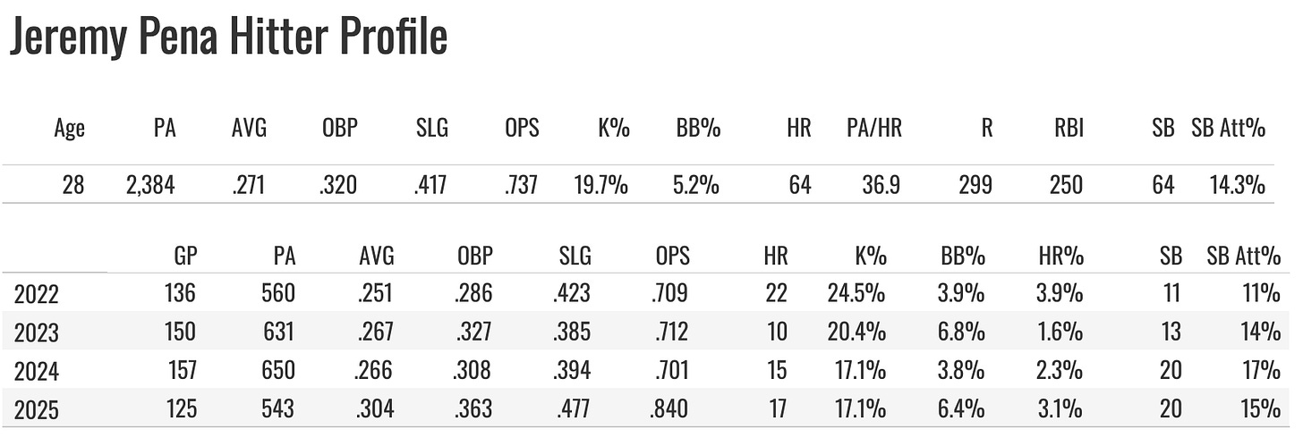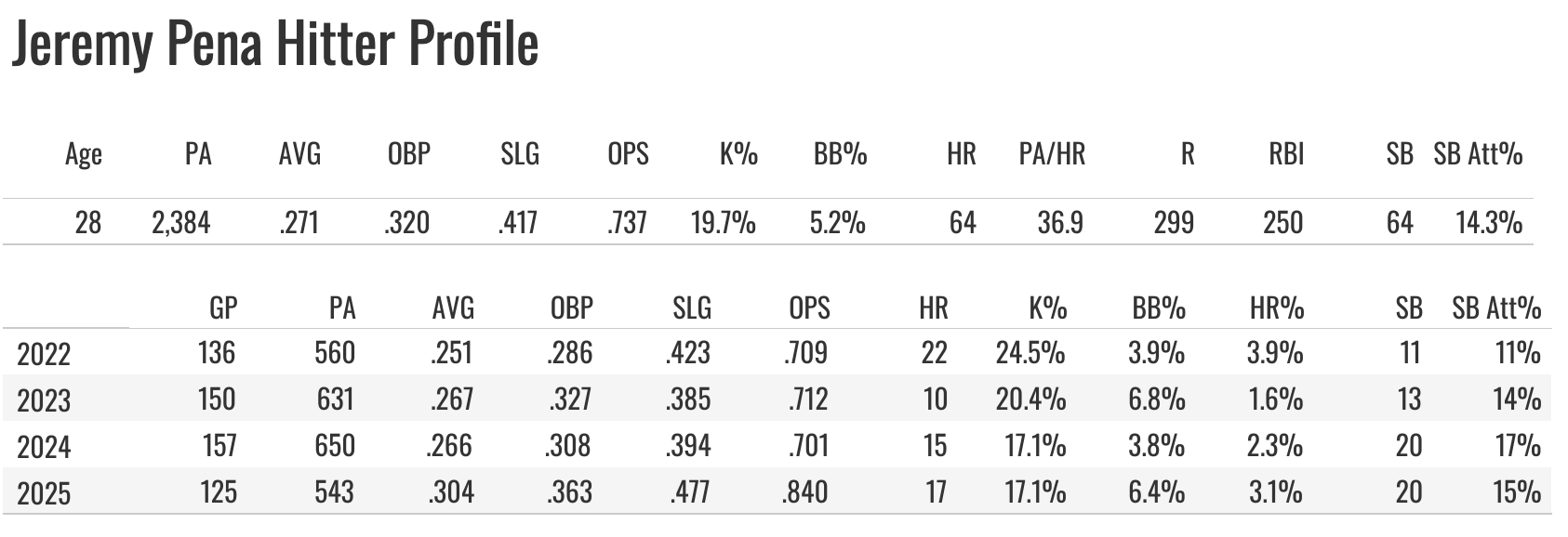 Pena deserves a much closer look. He had a breakout [fantasy] season in 2025, going for 17 bombs with 20 steals along with a career-best (by far) .304 batting average.