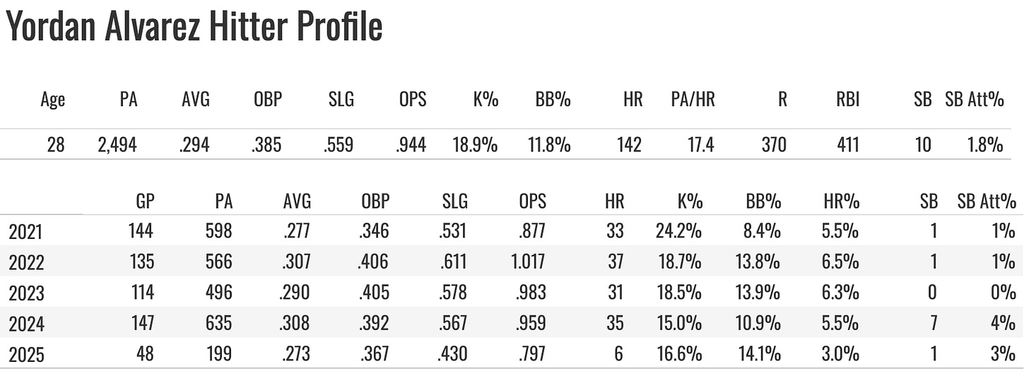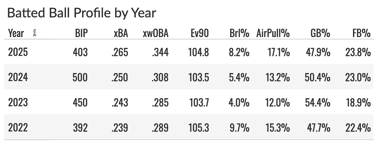 A near .950 OPS over the last five years. He has four 30+ bomb seasons, and it comes with a high batting average. He’s a top ten pure hitter in the league without question. It’s just about staying healthy. And 2025 was a bad year for him on that front. Those 48 games played crushed fantasy teams after he was a second-round pick last season.