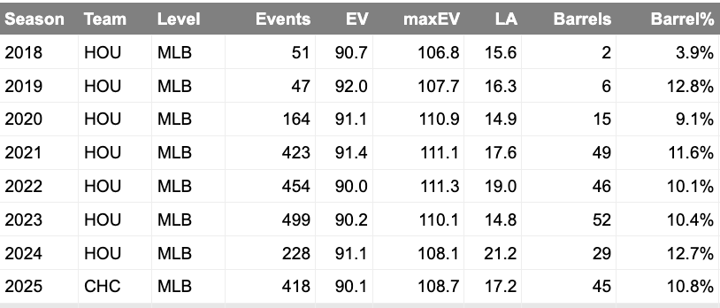 → First 4M: .240/.309/.369, 11.3% K%, 5.2% Brl%, .317 xwOBA, 101.6 EV90