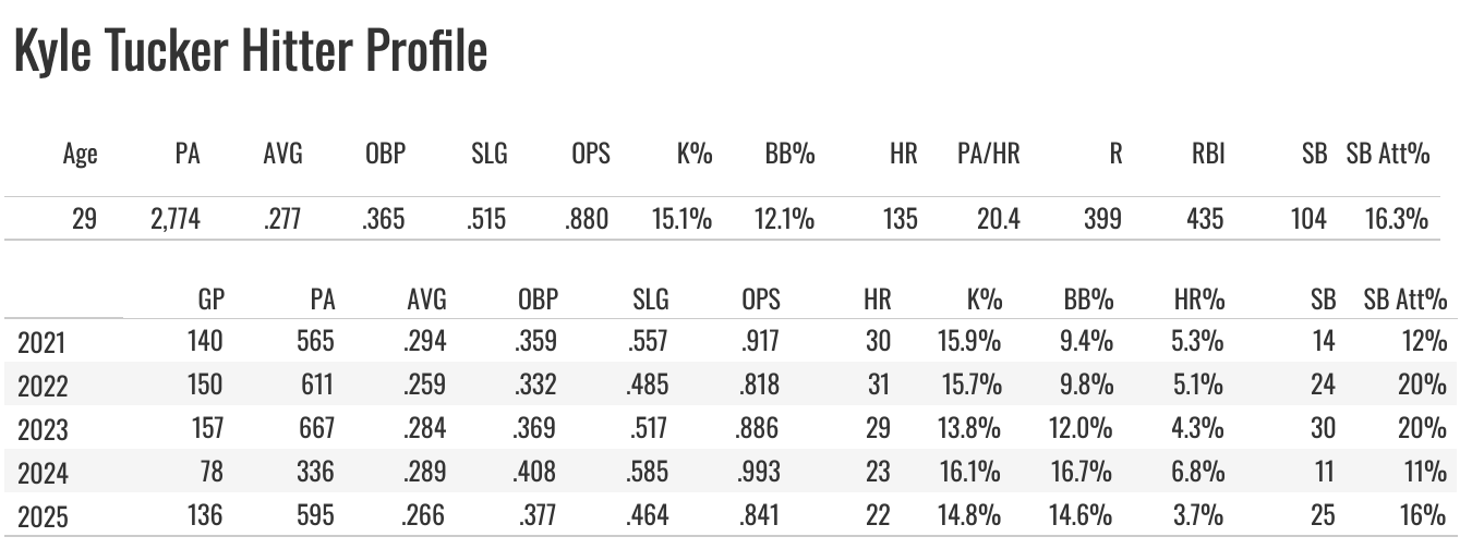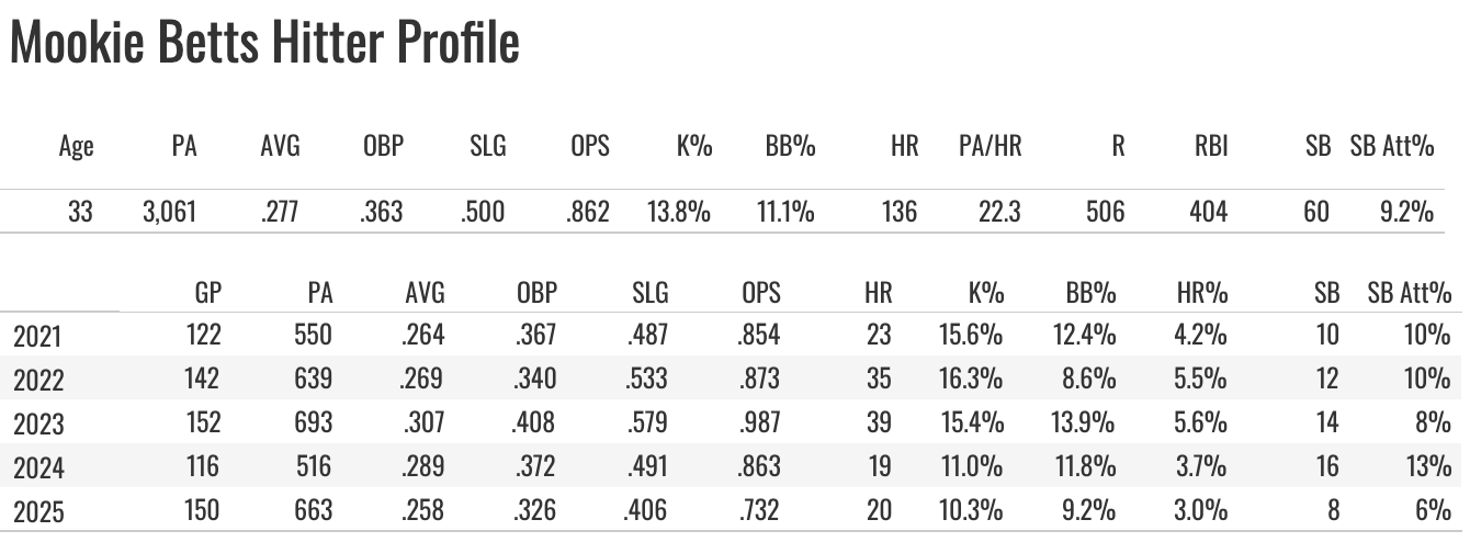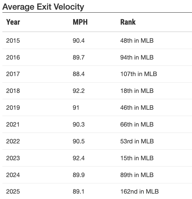 We’re at 39 homers in his last 266 games with just 24 steals. The saving grace prior to 2025 was the batting average and the buttload of R+RBI. He scored 95 runs and drove in 82 last year, but hit just .258.
