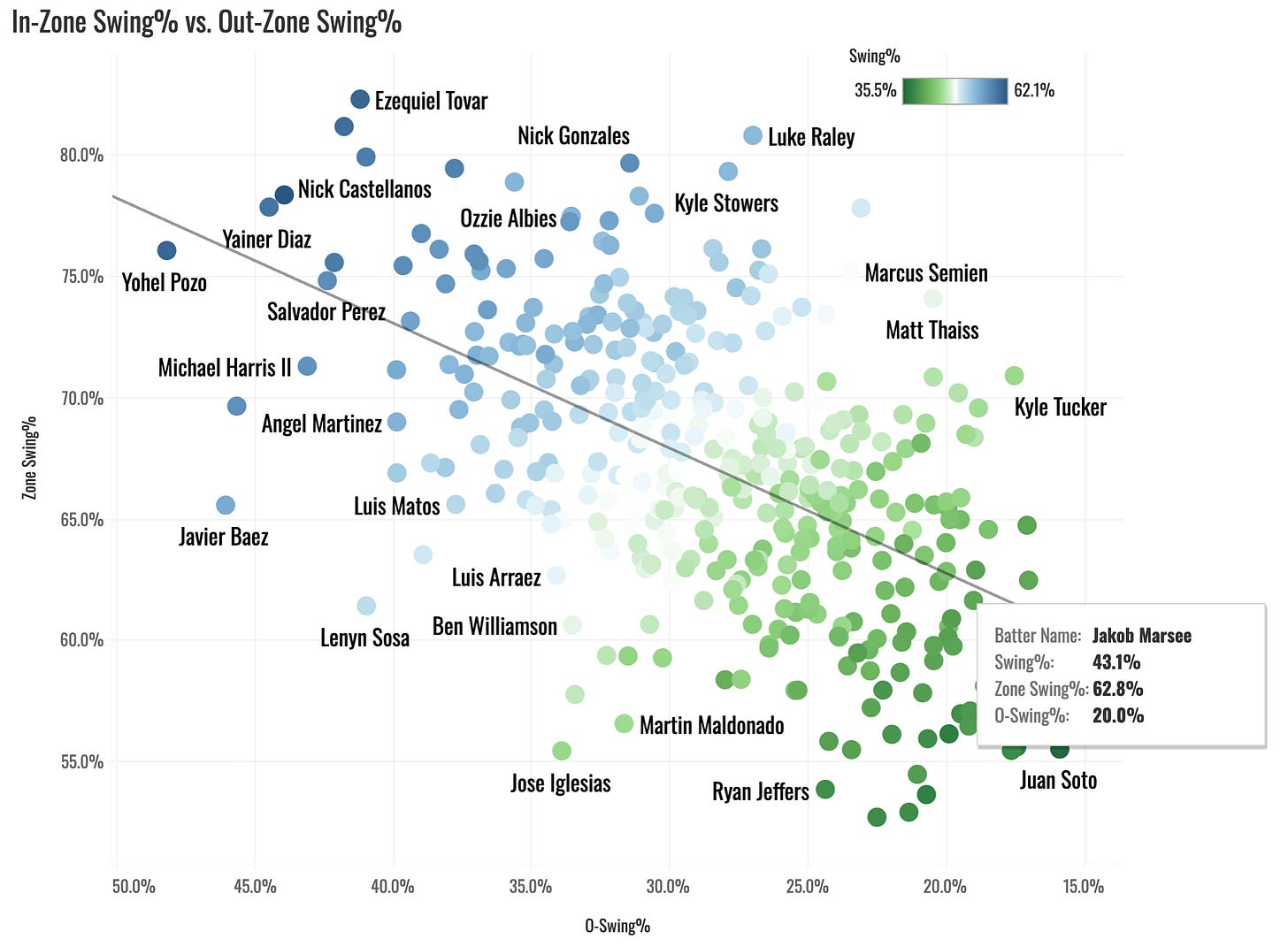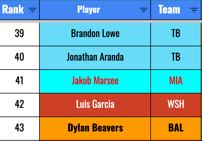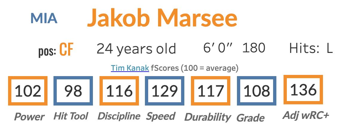 I have been almost wrestling with the projection model about Jakob Marsee. He’s in that weird sweet spot of having just enough MLB data to use for projecting, but not enough to avoid getting a weird projection if things are a certain way.