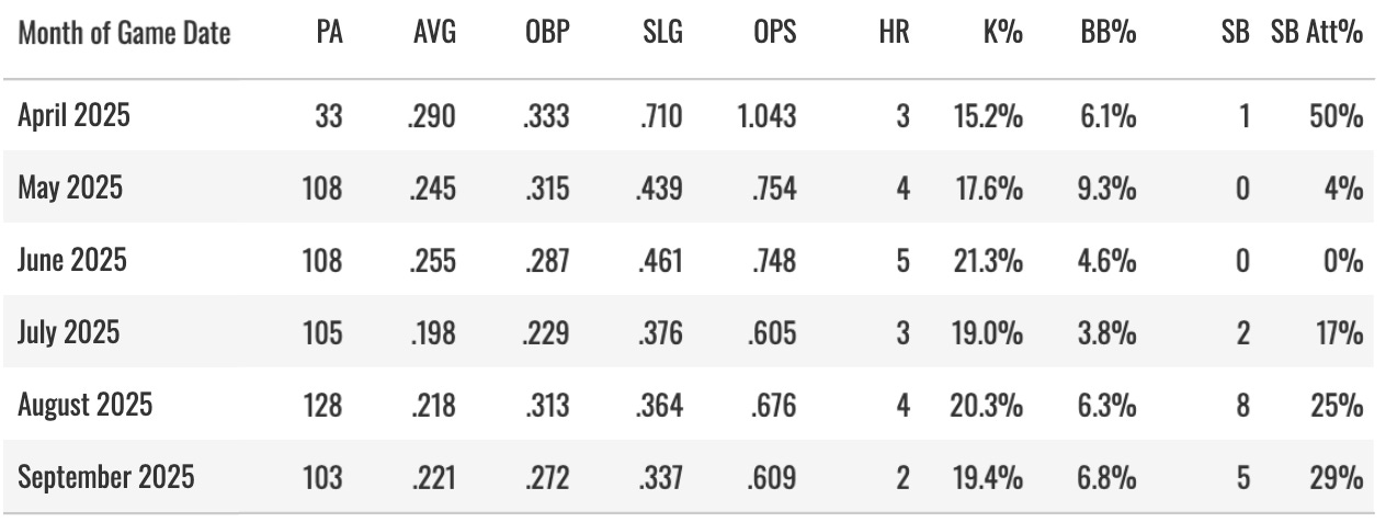 With his utter lack of power (0.8% Brl%, 100.5 EV90), pitchers have no reason not to throw him strikes. He’s not a threat to take you deep, and a walk is often like a double after he steals second base. For that reason, it was easy to see his 11% BB% from 2024 falling in 2025, which it did down to 7.9%. That’s still a higher walk rate than I might think. He has a good enough eye to take walks when the pitchers make their mistakes (but none of the walks are on purpose by the pitchers).