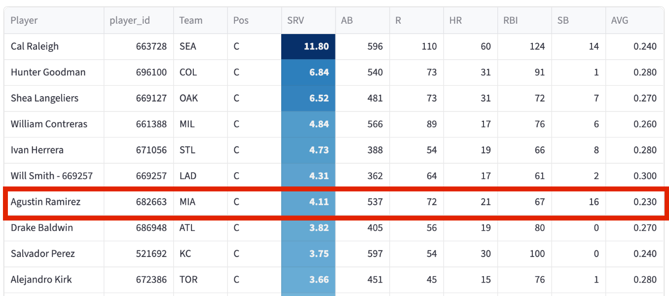 The most important part of his fantasy profile next year is the steals. I don’t suspect he’ll be stealing 15 bags five years from now, that just doesn’t seem to be how catchers go (although he also might not be a catcher at all in a couple of years). He is not a fast player with 36th-percentile sprint speed. But his swiping bags wasn’t new this year. Ramirez stole 22 bags in 2024 with a 17% attempt rate. That’s a good sign. But with the lack of actual speed, I could definitely see him coming in a handful of bags below the projections.