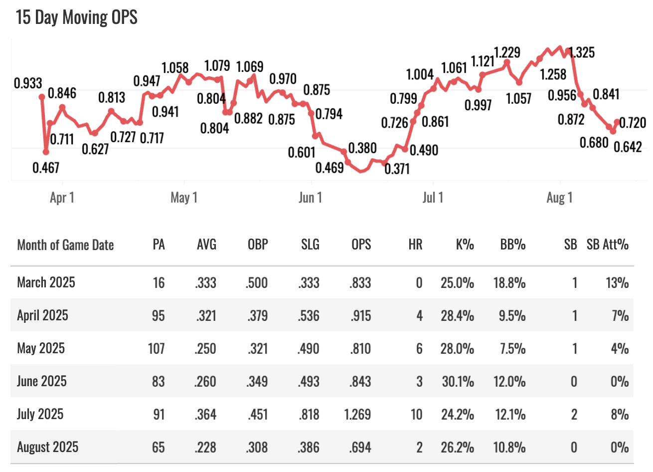 Ten bombs in July with a .364/.451/.818 slash line. Let’s look at some of the underlying marks: