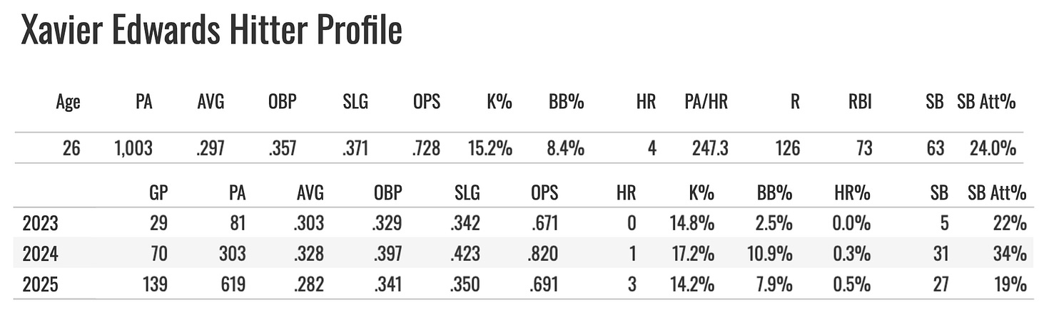 I appreciate guys like Xavier Edwards. We know who he is and what he’ll do. At least we know what he’ll do with a higher degree of confidence than with most players. Edwards has played less than two seasons’ worth of MLB games, but we can still figure him out.