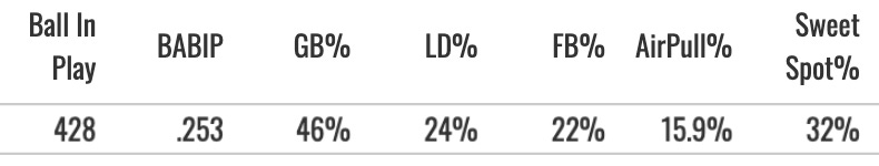 We have some problems with the contact. A 27.5% K% is very high, and the 75.3% Zone-Contact% is extra scary. He whiffs a ton. The .277 xBA was good, but he relied on a .354 BABIP to get there. The sweet spot rate of 40% was high. He just didn’t miss on contact.