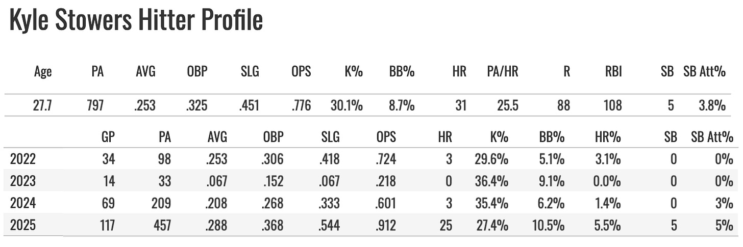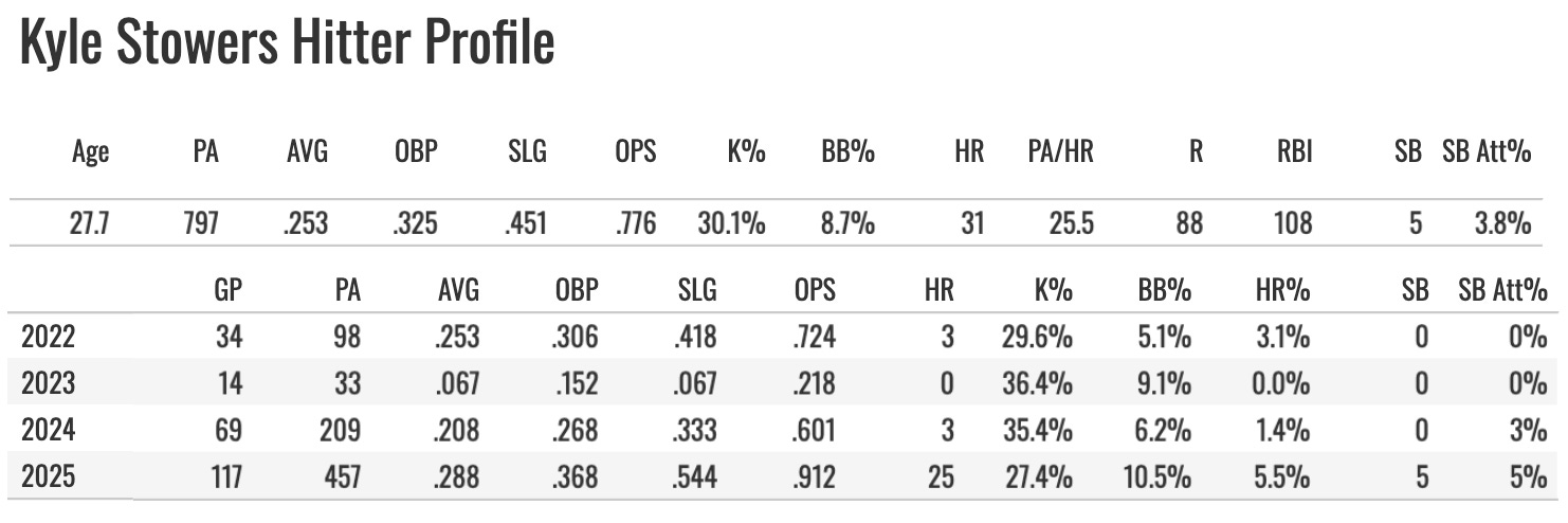 Stowers did a lot of damage in his 117 games. 25 bombs on a .288 batting average, and he threw in five steals.