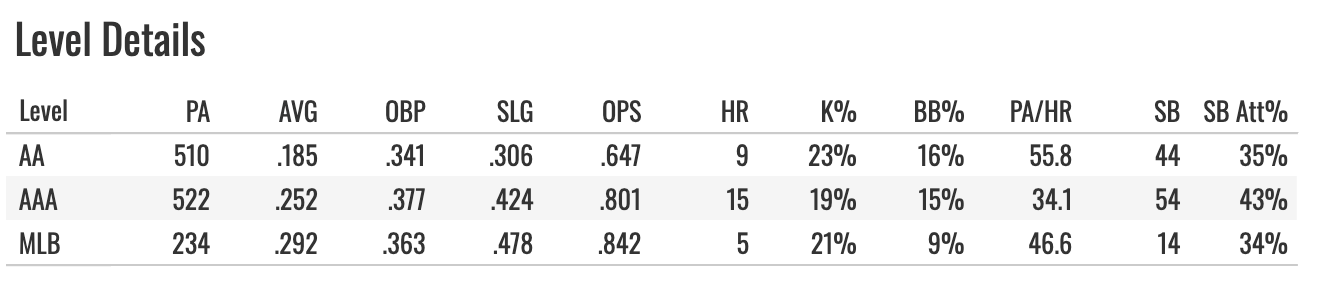 His 38% GB% in AAA and 17.7% Air Pull% is good news. With the lack of bat speed and exit velocity stuff, he will need to pull fly balls to get to the 15+ homers we’d like to get from a steals guy.