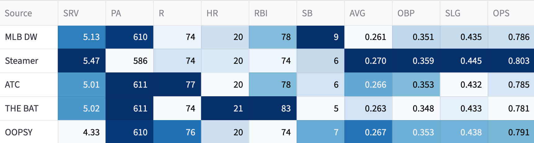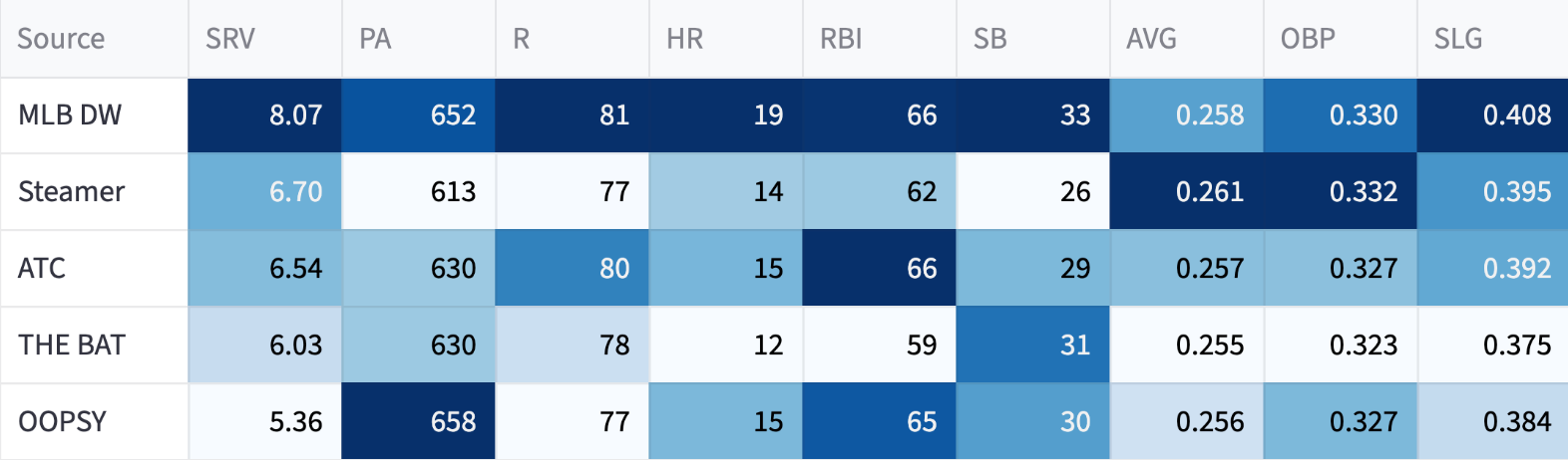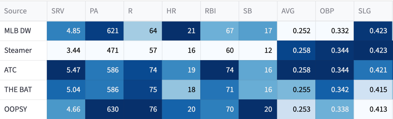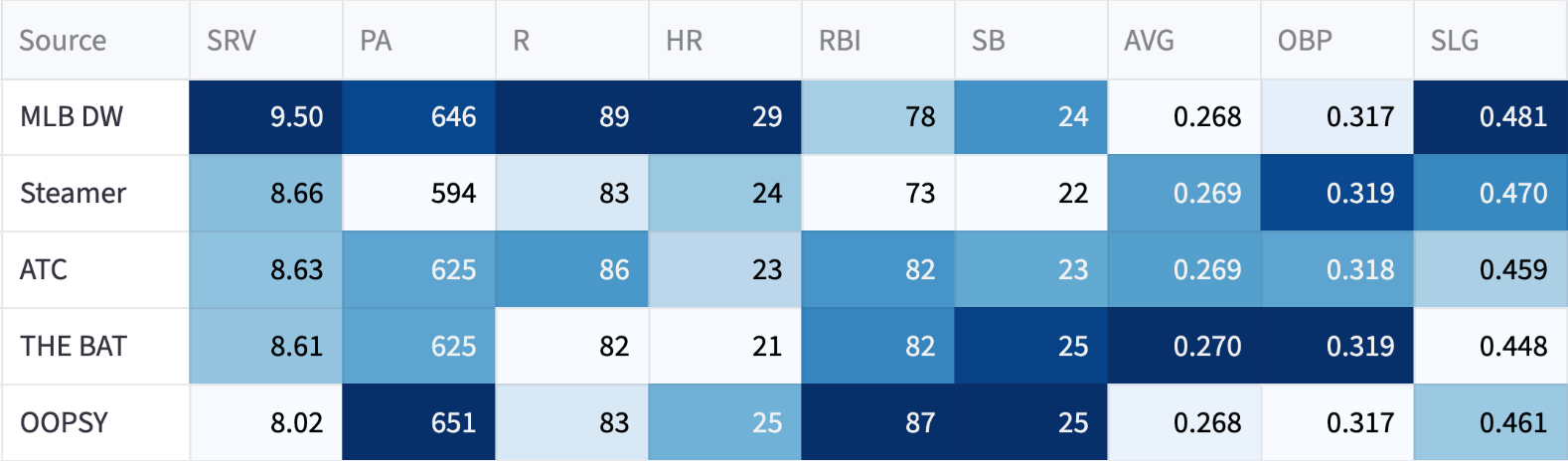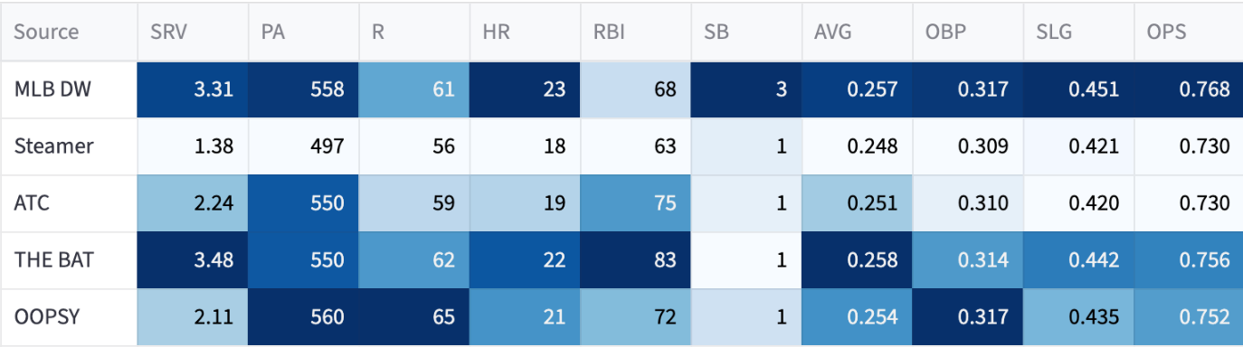 So I don’t think we’re buying into that home run rate. And the projections aren’t either. The highest system is OOPSY at 20 (not counting my own 21-homer projection).