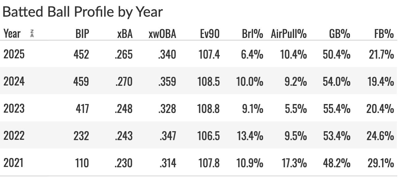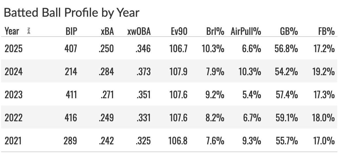 A 107.4 EV90 is awesome, but a 6.4% Brl% is bad. He rarely pulls it in the air, and his GB% of 50.4% is a problem for his power production - and that was the best of the last four years for him!