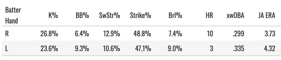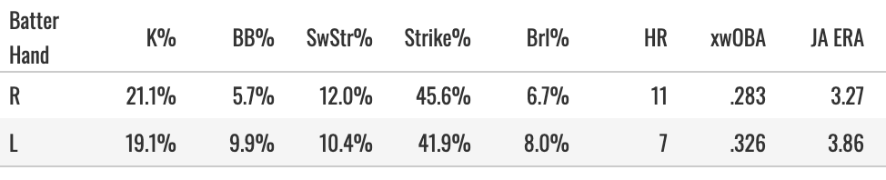A very bad K-BB% and 41.9% Strike% against lefties with a .326 xwOBA allowed. The sinker + slider make him tough on righties, but I think you’ll see teams stack lefties against him whenever possible next year.