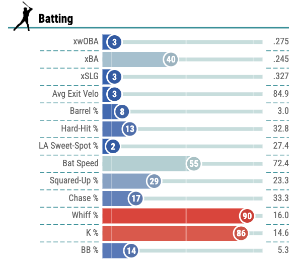 With 55th percentile bat speed and 85th percentile sprint speed, I suppose there’s some 15-15 upside for him. Not a lot of guys have both of those things, but it’s also not very easy to escape a 3rd percentile average EV and xSLG.