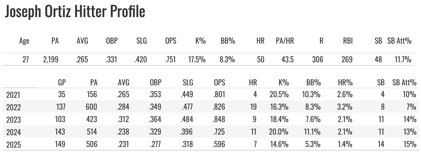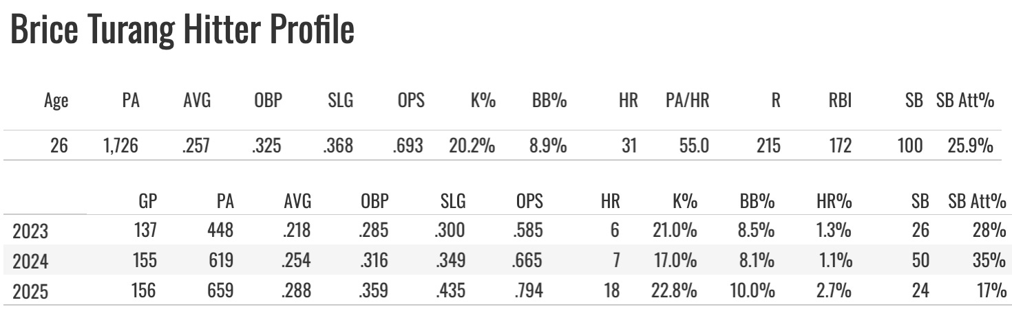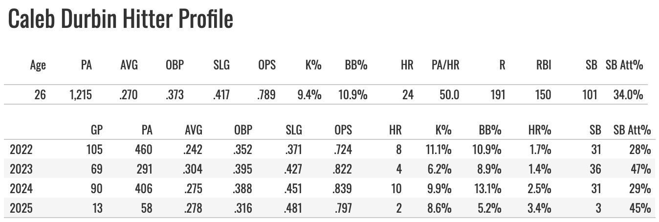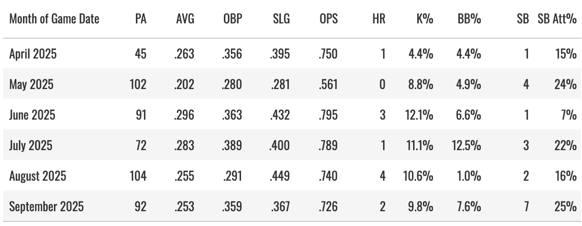The value in 2024 came from him swiping 50 bases. He hit .254 with seven homers for gravy, but he was mostly a steals guy. But then the attempt rate drops from 35% to 17%, and the K% actually jumps up to 23%.