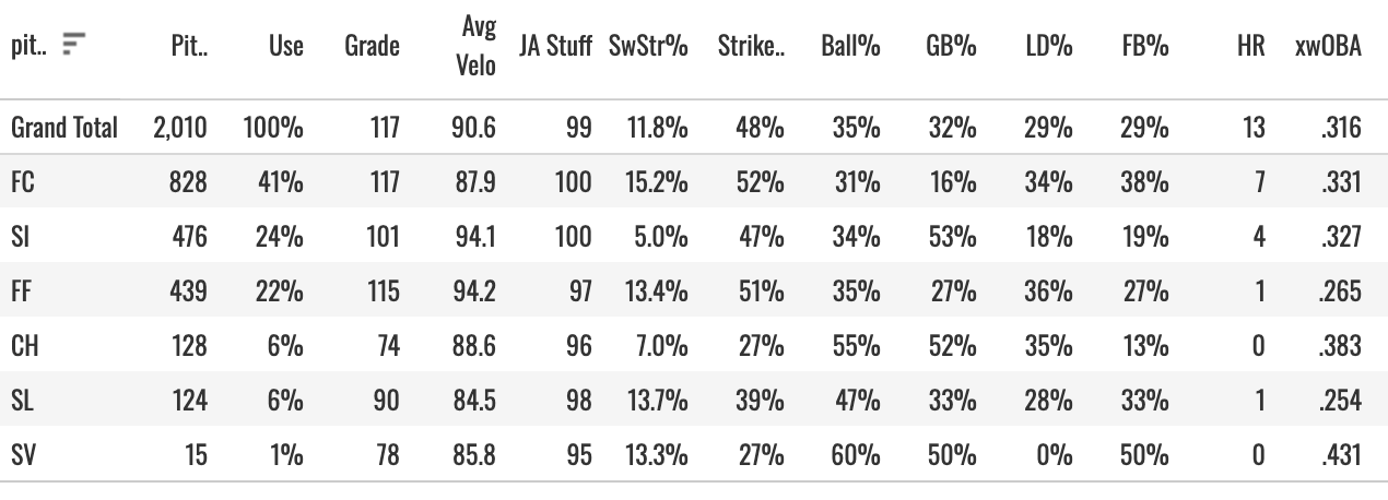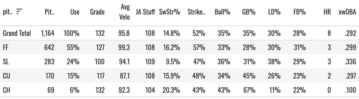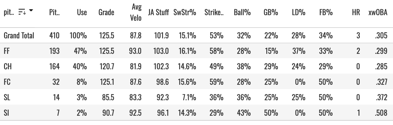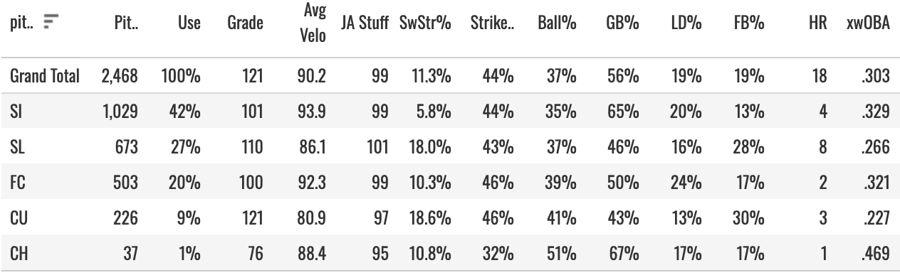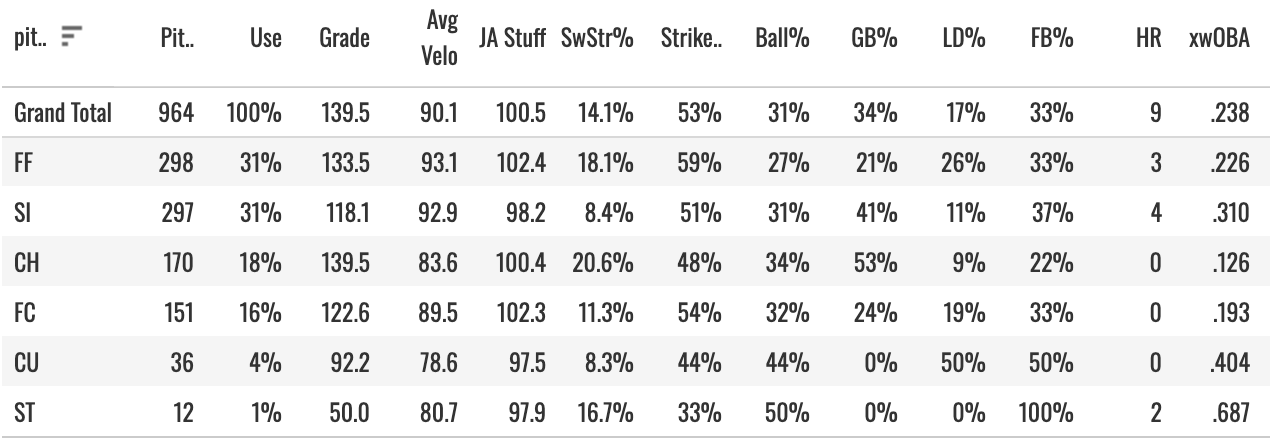 I have trouble believing in a 25% K% with a sub-12% SwStr%. But let’s get into this pitch mix to see what’s going on: