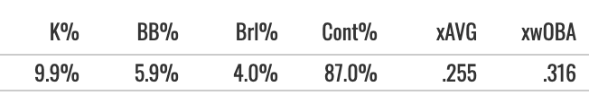 So he’s a discipline-first hitter. He makes a ton of contact (91.3% in zone) and kept the K% below 10%. That’s good stuff, but it comes with a lack of power, resulting in a 4% Brl% and a low .316 xwOBA.
