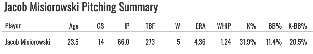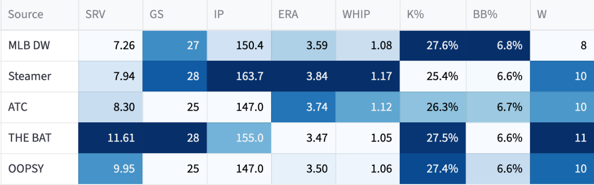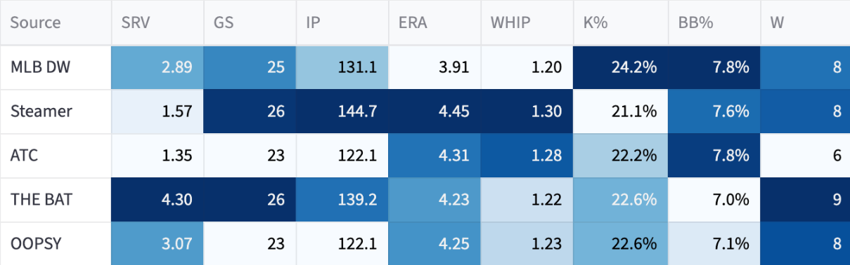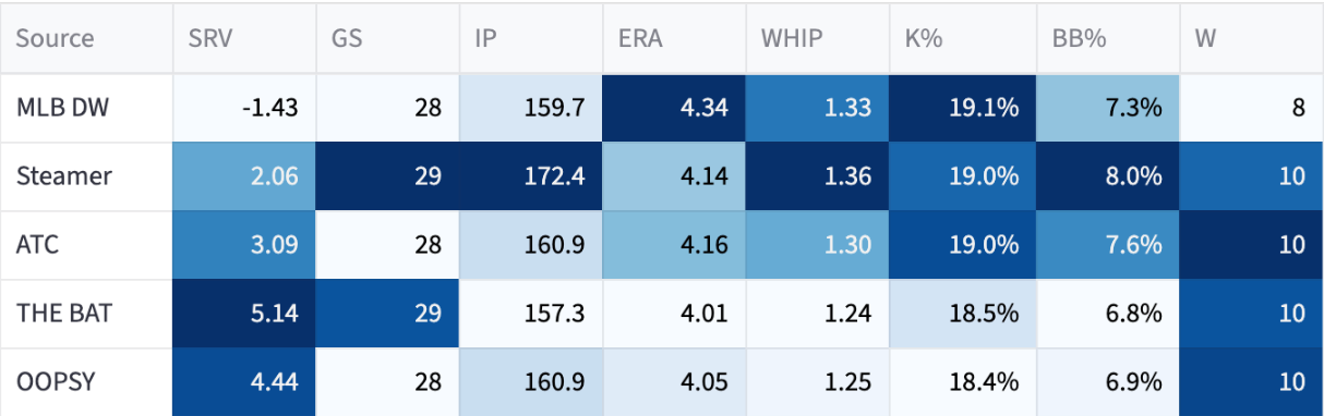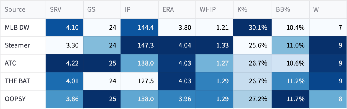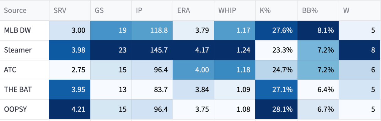 If he’s out there trying to get through the order three times, the numbers will fall off. I think he’s probably like a 23% K% with an 8% BB% and probably a home run issue against lefties. But we’ll see, he’s put up impressive numbers so far, so maybe he can be more Rasmusseny than I’m giving him credit for.