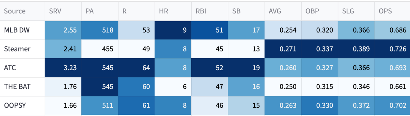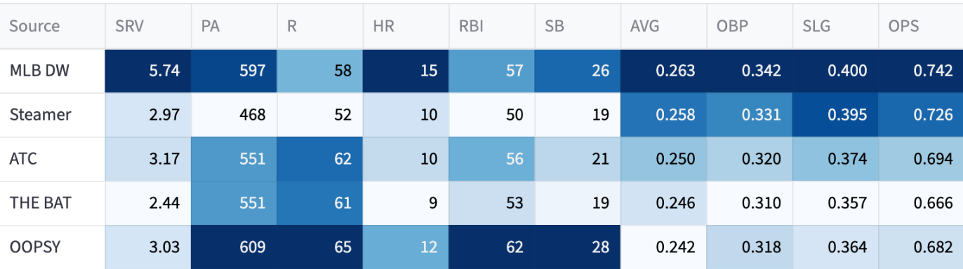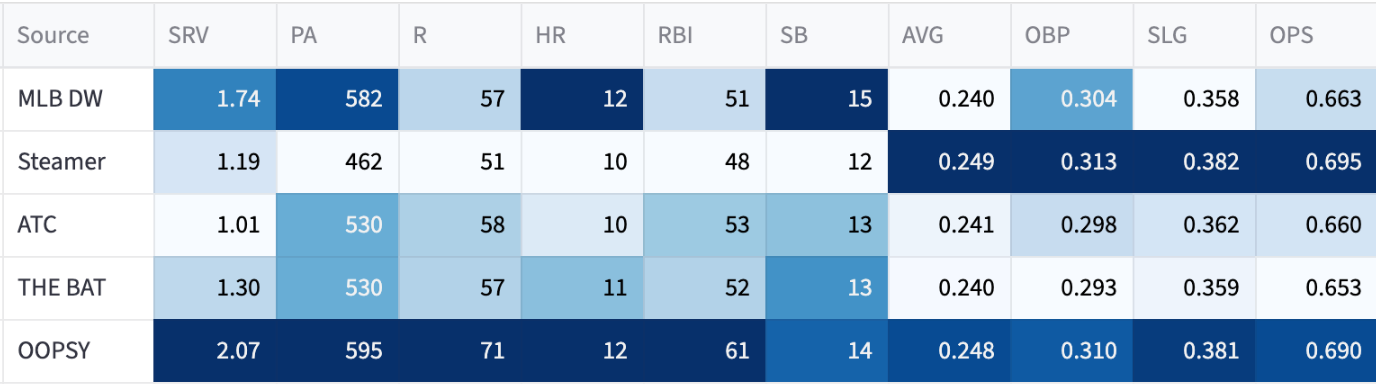 Once again, my system is wonky and overly optimistic. But look at OOPSY - 12 homers, 28 steals, .318 OBP. I’d take that at his ADP gladly.