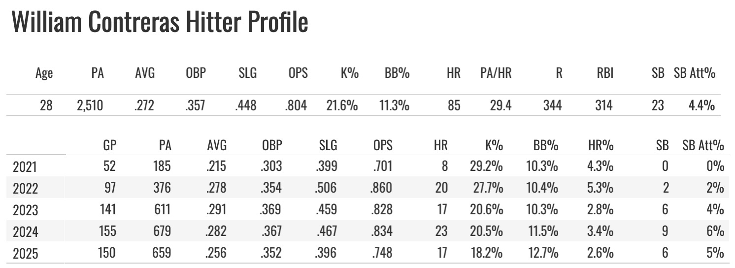 Contreras was the breakout catcher of 2024 and was the first catcher off of boards last year. That was a TRAP! Just 17 bombs and six steals for the guy in 150 games, and the batting average fell to .256.