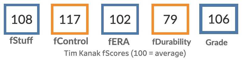 The size and velo are a concern. You don’t see too many big league aces at six feet tall (if he’s even that tall). His changeup was also good, but we’re in small-sample-size territory. The minor league fScores never liked him much:
