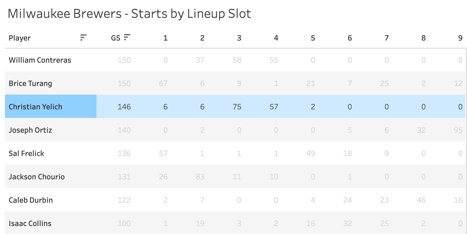 He runs well, but a 15% attempt rate with the .277 OBP doesn’t work out very well. There aren’t many opportunities to begin with. And all of that puts him at the very bottom of the Brewers lineup. They might even be looking to get Jett Williams in there for him this year if he continues his struggles with the bat.