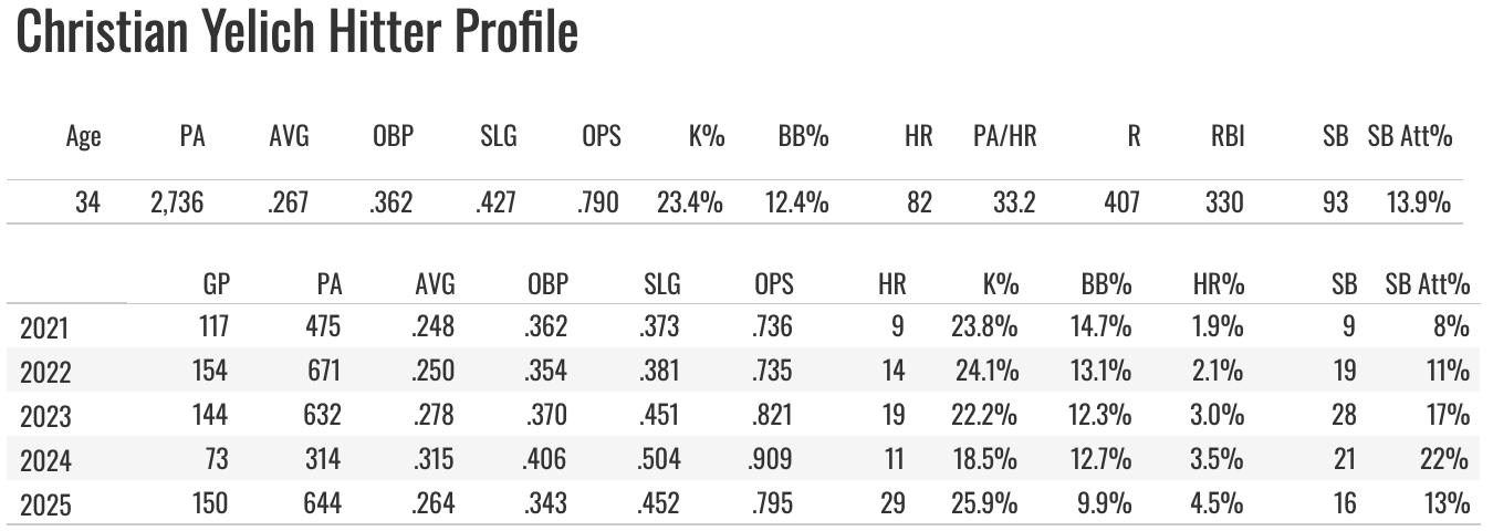 This Brewers offense and his high OBP have been very nice to him in the R+RBI department. He scored 88 times last year and drove in 103. That’s a big year. He was previously their lead-off man, but with Chourio and Turang in the fold now, as well as them liking Sal Frelick as a lead-off man against righties, Yelich was moved back to a run-producing spot in the lineup.