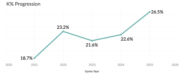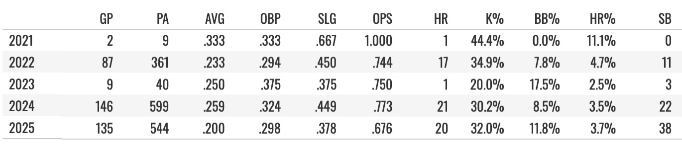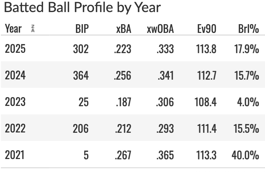 That’s the bad news. The good news is that the batting average is likely to come way up in 2026. We don’t even need advanced numbers to show that. His career batting average prior to last year was .250. Any time you have a season 50 points below your career average, you know it’s really likely that you perform a whole lot better the next season.