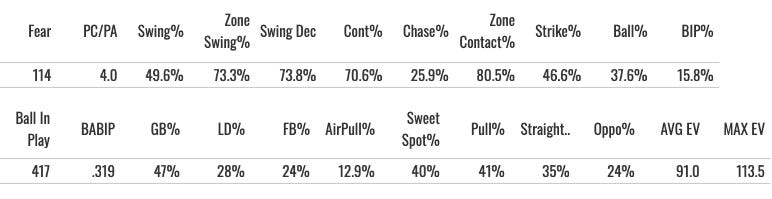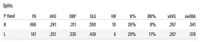 The other issue is that his lack of fly balls (25%) and air pulls (9.9%) limits the homers. It’s hard to see a guy with a max EV of 123 and an EV90 of 113.8 (ridiculous numbers) only hit 41 homers in two full seasons. Maybe he’ll figure it out; there’s still time. But the days of expecting 30+ homers are behind us. Let’s not do that.