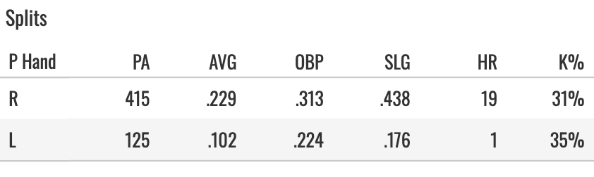 That was after back-to-back 24-homer seasons with a positive batting average. His strikeout rate rose by four points and the counting stats bottomed out for multiple reasons (one being that he sucked and the other being that the team sucked).