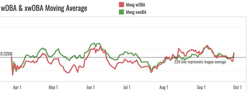 Randomness did Reynolds no favors last year. His xBA was more than 20 points above his actual, and the green line hovered above the red line for most of the season.