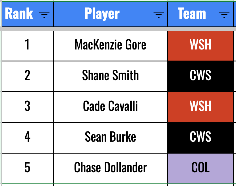 The other contender on the ranking as I write this is Shane Smith. Gore, for all of his faults, has clearly proven to be Major League worthy starter. He will take the ball every fifth game while healthy. You can’t say the same with Smith. I could absolutely see Smith breaking out and pitching way better than Gore, but I don’t think I can quite get myself to rank Smith above Gore. The innings and strikeout projections are going to point highly in favor of Gore.