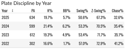 So a positive power score, but you can see that this plate discipline stuff has long been a problem. From 2024-2025 in the minors he went for a high 26.5% K% and a low 6.1% BB%. He swings a lot, chases a lot, and and whiffs a lot (72% Contact%). And that was against minor league pitching!