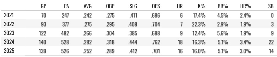 → 2025: 144 GP, .255 AVG, 19 HR, 31 SB