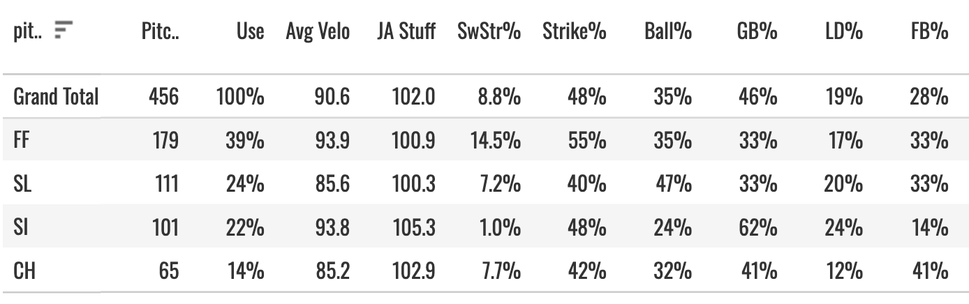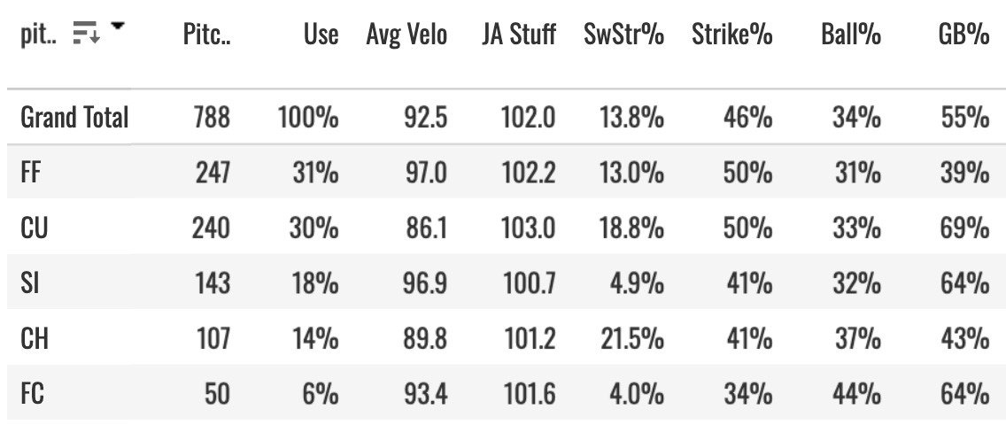 The curveball also went for a really nice 18.8% SwStr% and 33% Ball% combination with a 69% GB%! Two very strong pitches, and both graded out very well in my JA STUFF model.