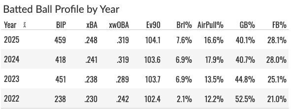 We find consistency here as well. The GB%, EV, Brl%, and plate discipline stuff are all really close from 2024 to 2025. He did become a bit more patient with a career-low swing rate (and consequently a career-low chase rate), but it didn’t make much difference on anything. I’d still take that as a positive. I like it when hitters become more selective as they age, but that’s not something that has a direct correlation to fantasy production.