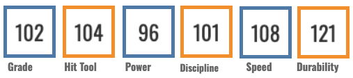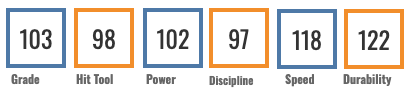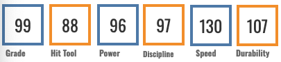 The raw power is there. Max EV of 112.4 and an EV90 at 106.2. He was around the 60th percentile in both bat speed and sprint speed. So there’s some raw talent here, but so far he hasn’t put much of it together at any level.