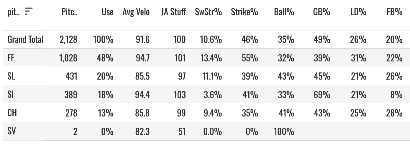That’s a heavy fastball and it grades out very well. The 13% SwStr%, 50% Strike%, and 31% Ball% are awesome to see. You know I’m a big fan of strong fastball foundations.