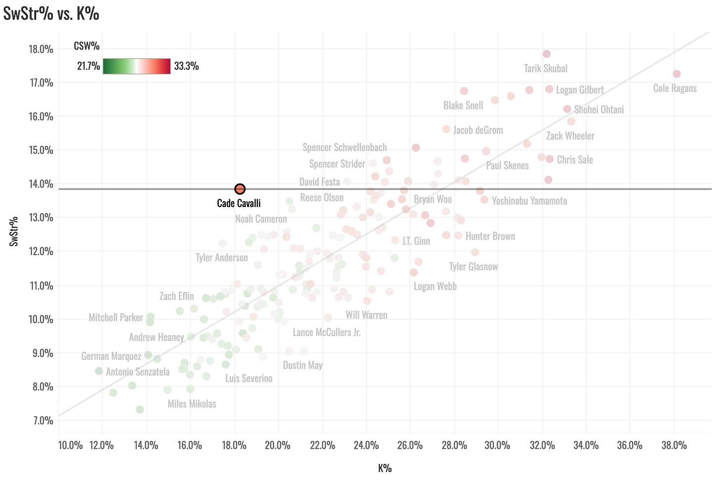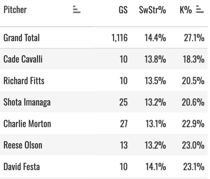 As you probably know, I love to look for those gaps between SwStr% and K%. For all starters with 10+ GS and a 13%+ SwStr%, Cavalli had the lowest strikeout rate. Look at it!