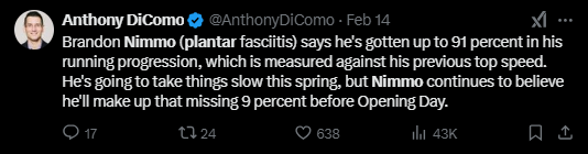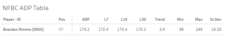 I would think this makes him a little cheaper, but not everybody in a given league follows the news, so you’ll probably have somebody take him pretty close to where that ADP has been set. I’m not doing that. Nimmo is not one of those game-breaking types. He’s more of a guy you’re just fine with, and now we know that he’s still dealing with an injury that could derail his season.