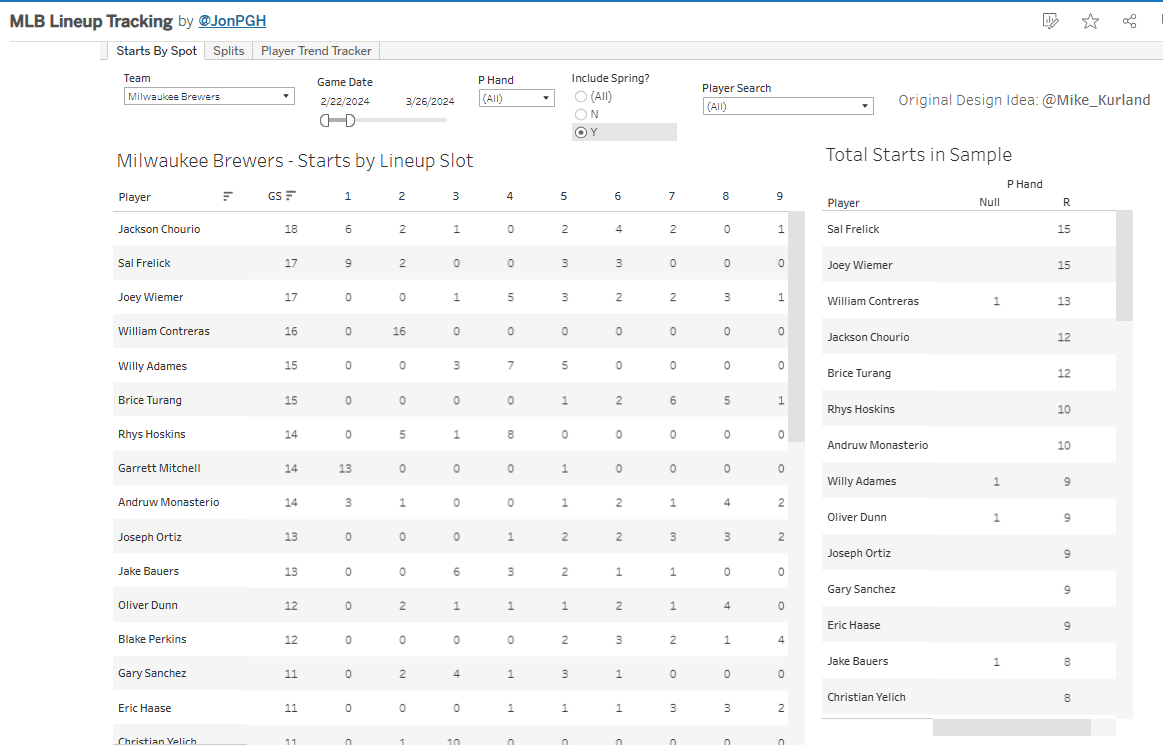 I also already have a lineup tracking Tableau dashboard I made for Mike Kurland last year. He’s temporarily retired, but the data and Tableau stuff were all mine, so I will just be continuing to update that.