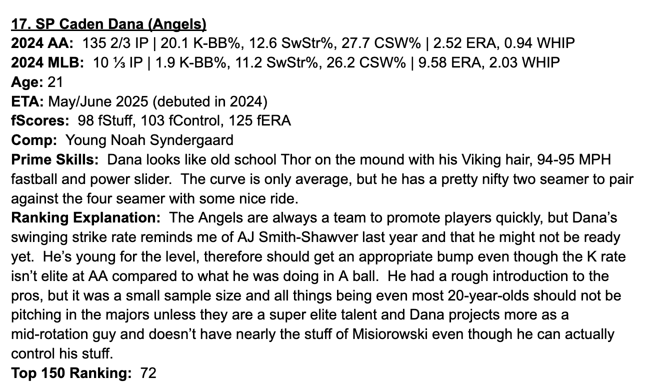 Mid-90s four-seamer and a power slider! That’s a decent recipe for some strikeouts. The Angels don’t have a fantastic rotation, but they do have four guys who are clearly going to start the year in the rotation. Dana’s only path to a spot in there would be an injury or beating out Reid Detmers.