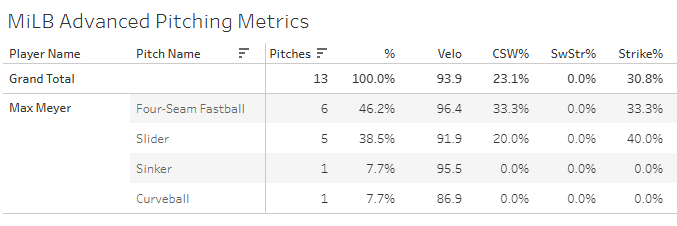 Max Meyer threw 13 pitches this week. The only thing you can ever take from 13 pitches would be what pitches were thrown and how hard.