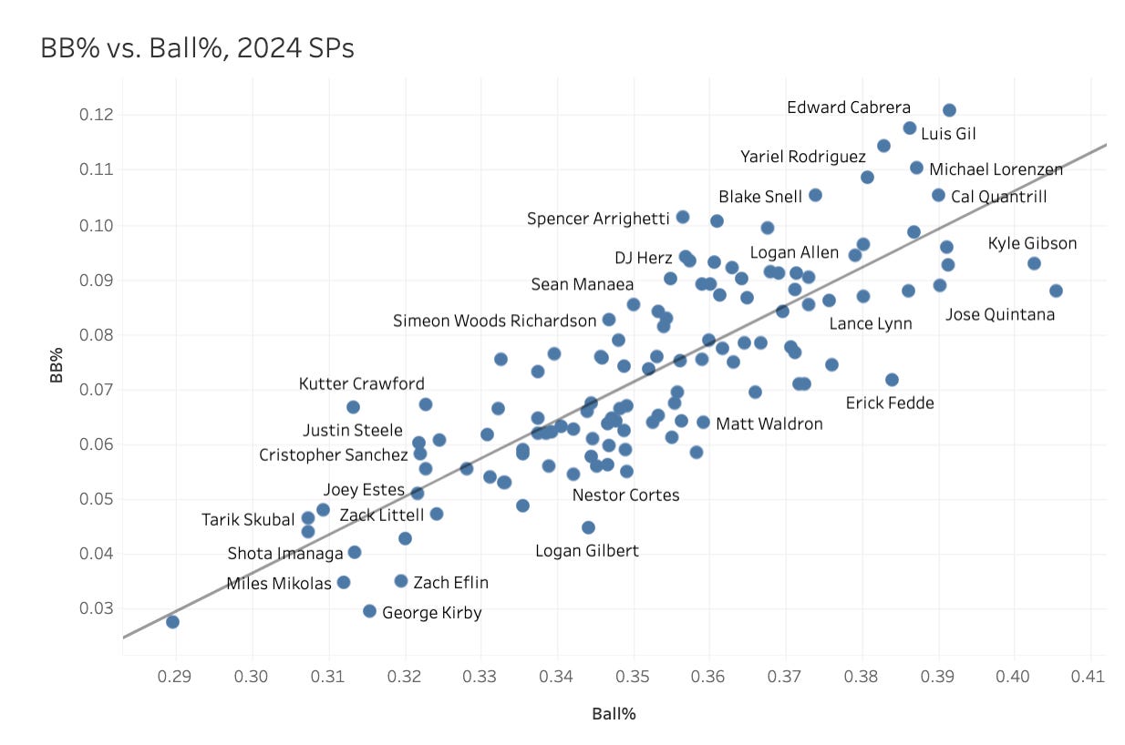 This stuff isn’t always as simple as input Ball% = output BB%. Some guys are better (or more willing?) at throwing strikes when they absolutely need to, and that can change things. I whipped up a quick scatter daddy: