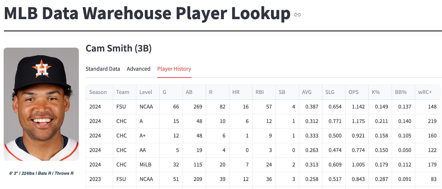 Let’s talk about this Cam Smith guy. He’s an Astros’ prospect whom they acquired in the Kyle Tucker trade. And he’s having a huge spring (.409/.519/.773, two homers, 18.5% K%, 18.5% BB% in 27 PAs). He was the 14th overall pick in the draft last year out of Florida State.