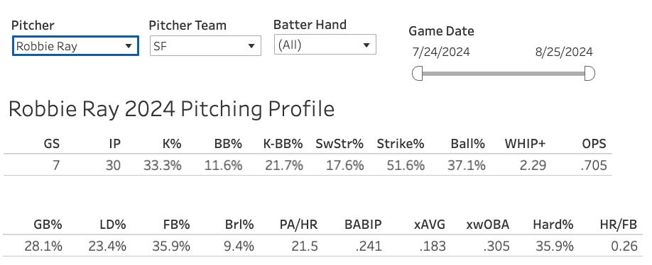 The thing I picked up on when I was evaluating him was the mismatch between the 11.6% BB% and the 37.1% Ball%. A 37% Ball% is high, but it’s usually a 9-10% BB% rather than 11%+. Ray projects for a 27.5% K% and an 8% BB% for me this year. I could see something like 29% and 9%, but he’ll be around that range. It will be a high K% and a not-great BB%, but I think it can work pretty nicely. I like him.