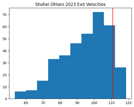 So 90th-percentile EV is the winner by a decent margin. What is the 90th percentile EV? You simply take a list of all exit velocities from each hitter, and find the mark where 89% of the values are less than it. Here is Ohtani’s 2023 90th percentile shown compared with the rest of his EV distribution:
