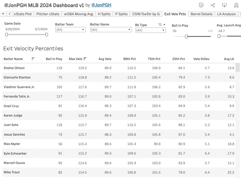 This post brought to you by the “Exit Velo Percentiles” tab of my Main MLB Dashboard. Here’s a preview of it, but you’ll have to be a paid subscriber to get the full dashboard and the daily updates on it. Here’s what it looks like: