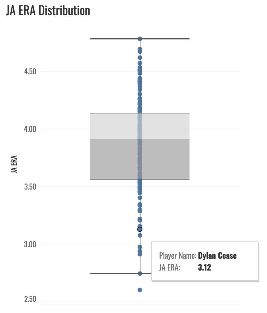 There’s also a BOX AND WHISKER plot to the right. That shows you the distribution of JA ERA.