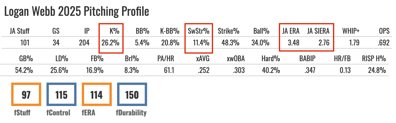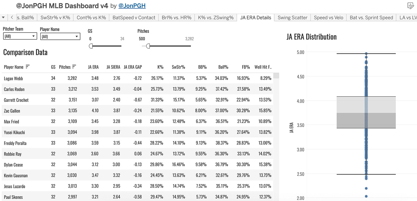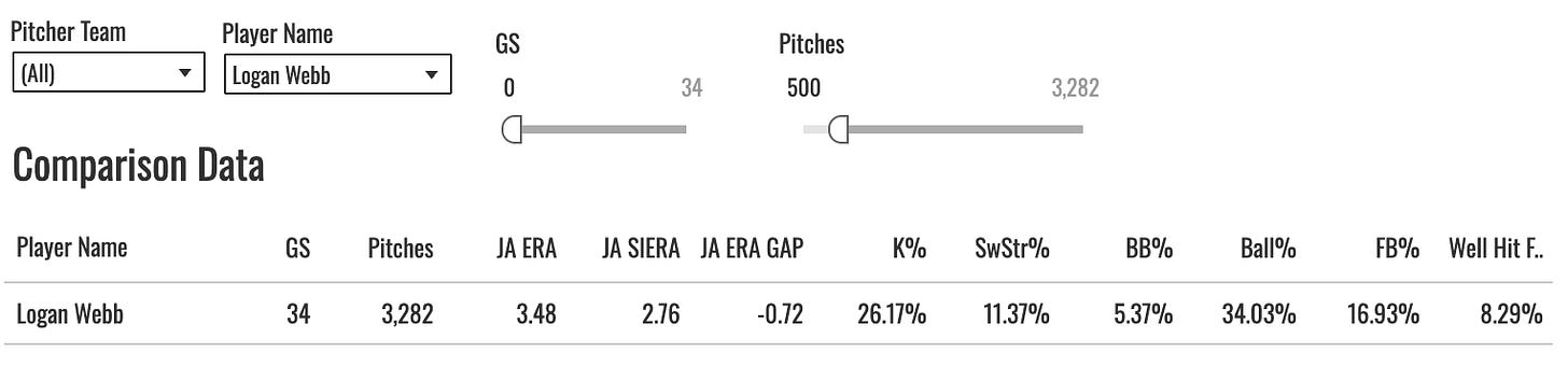 In this case, you see the JA ERA way up at 3.48 while the JA SIERA sparkles at 2.76. JA ERA is viewing him as a below-average K% pitcher while JA SIERA does not. In the case of Webb, JA SIERA is probably the better pick because we know of the track record. But with a smaller sample size and a lesser-known pitcher, my prediction for the future would be a declining K%, and JA's ERA would now reflect that.